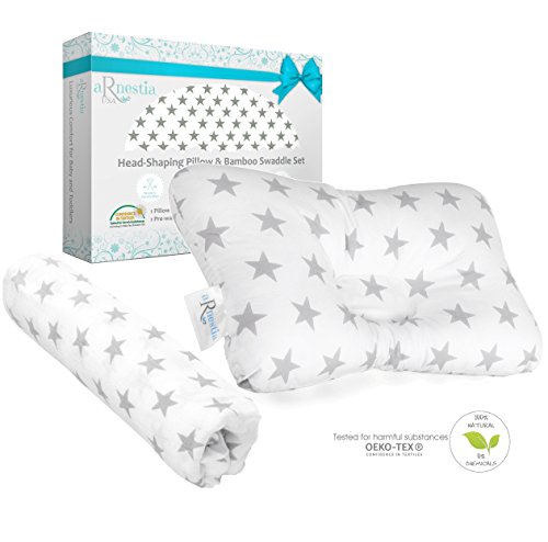 Studio : Arnestia USA Publisher : Arnestia USA Binding : Baby Product Product Description HOW TO CHOOSE THE BEST BABY FLAT HEAD PILLOW ? The curvature at the base of the pillow ensures comfort by providing neck support, as well as the ideal shoulder room ? Our pillow's Inclination and shape distributes pressure evenly, thereby helping to prevent Flat Head Syndrome. ? Low profile helps keep your baby's head and spine in alignment, which is proven to reduce the pressure on the back of your baby's head by at least 50% ? Made with the finest and purest Cotton, which is naturally lightweight to reduce heat retention. ? Our pillow is tightly woven from hypoallergenic natural cotton and hand-stitched with sterilized equipment at a facility that manufactures baby textiles for hospitals. ? Pillow can be used in a swing, tummy time support, or photography prop. WHY SWADDLE? ? Swaddling recreates the comforting security of the womb ? Breathable 100% Bamboo fabric is hypoallergenic and gets softer after each wash ? Other "Bamboo" blankets are only 70% Bamboo and are not the safest choice for your baby ? Generous size of 41" by 41" - can also be used as a nursing cover up, play mat, burp cloth, and more. A VERSATILE GIFT SET FOR A NEW PARENT ? This gift set includes a beautiful pillow and a blanket in a box ? Gender Neutral White Gray colors -- A unique baby shower gifts for Boys or baby shower gifts for Girls OUR GUARANTEE!