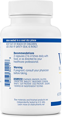 Calcium/Magnesium (citrate/malate) work together to support a healthy cardiovascular system. Calcium is necessary for healthy teeth and bones, and Magnesium supports muscle and nerve function and helps the body to metabolize and absorb calcium. Calcium also maintains healthy heart function and normal colonic cell growth. It also helps to maintain normal mood during the menstrual cycle. Calcium and Magnesium have been shown to support a healthy mood and demeanor during PMS. Calcium/Magnesium citrate is one of the most bioavailable forms of these two minerals. Vital Nutrients mission is to manufacture superior quality nutraceuticals that exceed both industry and government standards and provide clinically effective results. They provide over 200 science-based and clinically effective products. They have a comprehensive quality assurance program to ensure that purity and potency is consistently met on every product that they manufacture. Vital Nutrients uses independent U.S. ethical laboratories to test all raw materials and finished products. Each raw material is tested, regardless of origin, for purity and potency. All finished products are tested through a real time stability protocol for expiration date validation. They are an FDA Inspected facility that exceeds FDA cGMPs, and a member of the NPA.