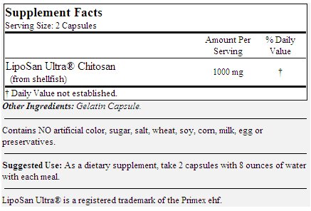 -. Binding : Health and Beauty -. Feature : Premium LipoSan Ultra® ingredient the better than standard chitosan. / Solubilizes in the equivalent of stomach acid in less than 5 minutes. This is in comparison to regular chitosan that can take upwards of 2 hours to dissolve. / Contains no fillers or stearates. -. IsAdultProduct : 0 -. Label : Bestvite -. Manufacturer : Bestvite -. MPN : 8080 -. PackageQuantity : 1 -. PartNumber : 8080 -. ProductGroup : Health and Beauty -. ProductTypeName : HEALTH_PERSONAL_CARE -. Publisher : Bestvite -. Studio : Bestvite -. Title : Liposan Ultra Chitosan 500mg (240 Capsules)