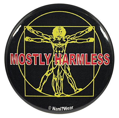 Binding : Apparel Product Description In the Hitchhiker's Guide to the Galaxy, the original entry was just one word: Harmless. Then Ford Prefect expanded it to two words: Mostly harmless. This button is a 2.25 inch (5.715 cm) pinback button that can be pinned anywhere, on a jacket, a book bag, messenger bag, or any clothes. Perfect for convention gear. Buttons make great stocking stuffers, or party favors for your next geek get-together. Button has a black background with DaVinci's Vetruvian Man to resemble the original CG from the 1980 BBC television show, with red lettering. Button is printed on professional laser printer, and assembled with a professional button making machine. 0