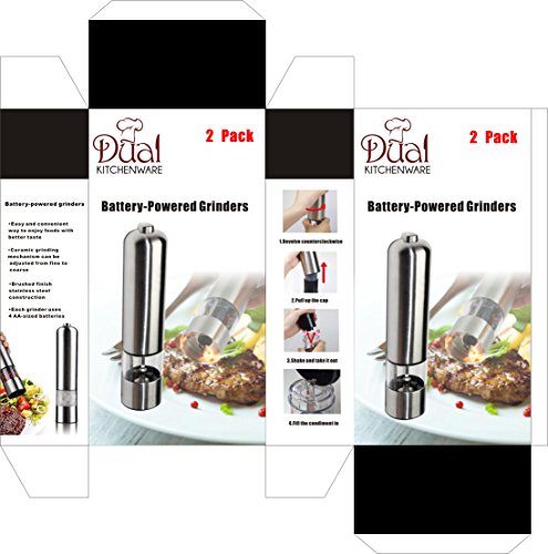 AUTOMATIC BATTERY-POWERED CORDLESS GRINDERS: DualKitchenWare Electric Salt and Pepper Mills is a set of 2 battery-powered cordless salt and pepper grinders, with each grinder using 4 reliable AA-sized batteries. Designed for restaurant, hotel and home kitchens, the grinders can be moved around the kitchen when cooking without power problems.