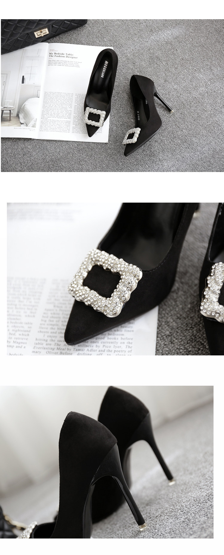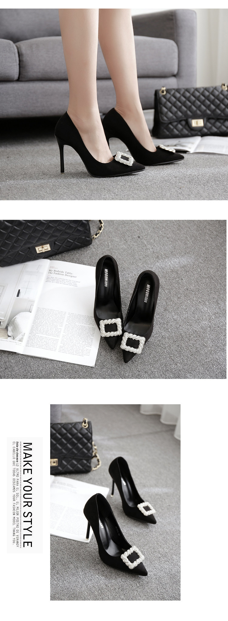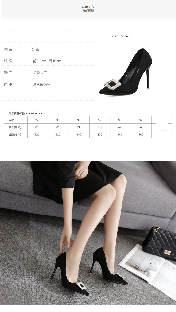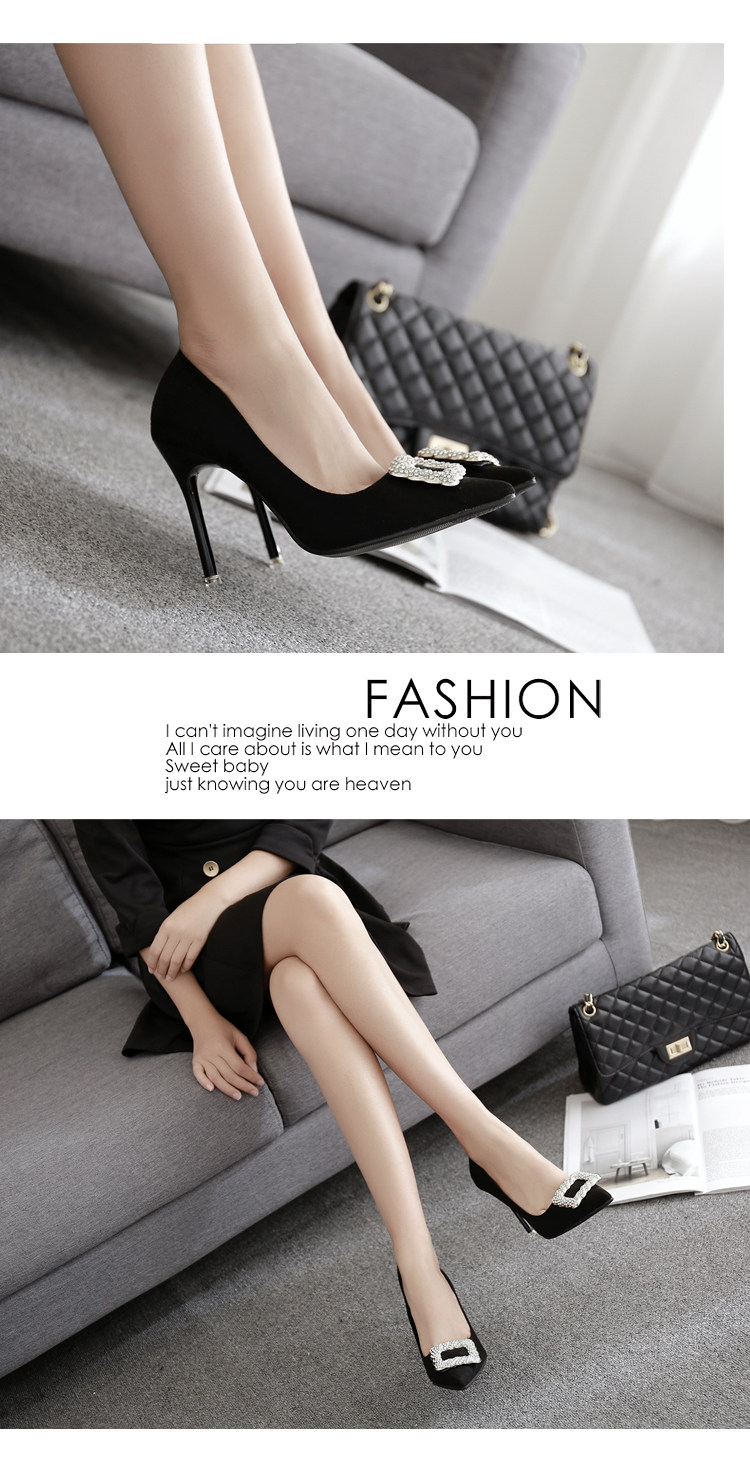 春季水钻方扣高跟鞋细跟尖头黑色工作鞋性感百搭单鞋女鞋