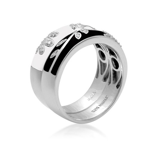 The Sterling Silver Enamel Floral Diamond Stack Ring features artistic designs and contrasting colors for a gorgeous result. The half white and half black shades are deftly done with enamel. Spanning both sides are beautiful designs of flowers and vines done with lustrous silver and sparkling diamonds, which total 1/10 carat. The ring measures just under 1/4-inch in width and is forged of high-quality 925 sterling silver. Its simple yet ample beauty makes it a truly great choice for any outfit or occasion.Feature