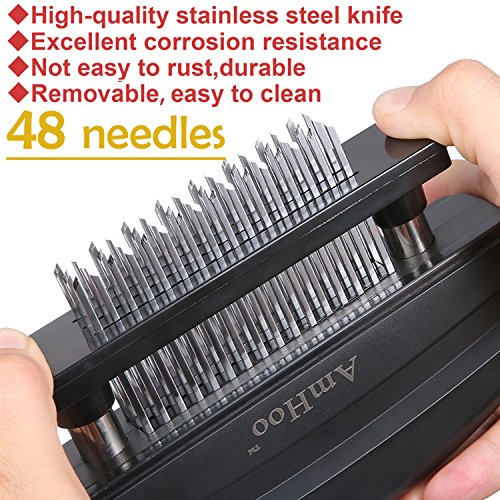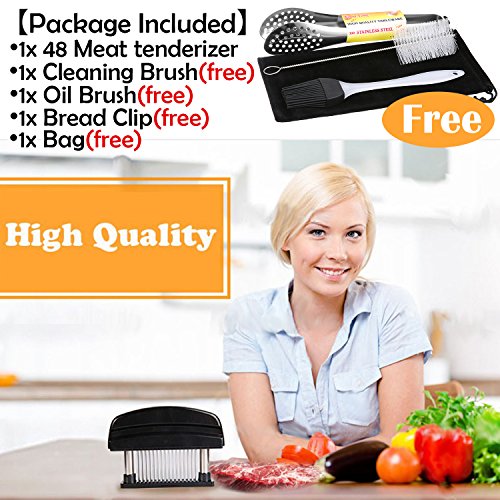 Product Description Features: 48 stainless steel blades with hard texture, corrosion resistance and not easy to get rusty. that can shorten the time, cut off the fleshy fiber to make meat tender, not plug teeth ) ABS hand press handle with spring design will bring you much convenience. BPA-Free, FDA Approved. Indispensible for dialy life,Suitable for home kitchen, hotel, restaurant and so on Specification: Color: Black Size:9inch* 1.4inch * 4.3inch Item Weight: .0.7lb,light weight carry out easyly Material: 100% Food Safe Grade Stainless steel blade ABS How to use it 1.Please cleaned thoroughly for the first time using 2. Align 2 pillar to base hole and push down 3. Grip the handle, remove it over the meat, press down 4. Push 2 locker ring inside 5. Assemble protective plastic cover How to clean it 1. Pull 2 locker to outside 2. Hold the body and pull up 3. Clean it with water or clean brush Please Note: 1.Please place the meat on the cutting board to prevent injuring the blades. 2.Eliminate the bones or thaw frozen meat firstly before you use the item to prevent breaking the blades. 3.Don't put your hands on blades when you use this item and Keep away from children. Clean and dry the water after use. 【Packaging Included】 ?1x 48 Pin Tender Meat Needle 1x 7 " Stainless Steel Food Clip(free) 1x Cleaning Brush(free) 1x Oil Brush(free) 1x Storge Bag(free)