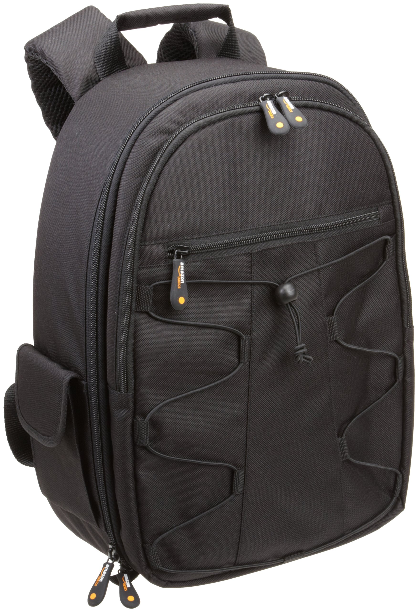 This camera backpack can accommodate a small SLR camera body, three lenses, and additional small accessories.