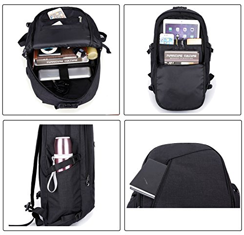 -. Feature : FIXED ANTI-THEFT PASSWORD LOCK: Equip with password lock to help prevent theft and keep your wallet and other items inside secure while travelling. For example, there is no need to worry about the zipper pockets are opened when you line up.At the same time, the fixed lock do not worry that it will be lost, it's convenient and safe.(The lock Using Manual as the seventh picure shown, pls read the operation manual carefully first.) / USB CHARGING PORT & HEADSET INTERFACE: Combination with practical and entertaining, it is great to enjoy the convenient charging by connected with the portable charger and your electronic device, such as CD or MP3 player & Android devices. / LARGER CAPACITY: Design with 3 MAIN pockets & 9 INNER small pockets & 2 SEALED SIDE pockets. Large capacity multi-compartment, easy to place 12-16 inch laptop, textbooks, magazines, iPhone, iPad, pen, keys, wallet, books, clothes, bottle and more. / Comfy & Sturdy: Comfortable airflow back design with thick but soft multi-panel ventilated padding, gives you maximum back support. Breathable and adjustable shoulder straps relieve the stress of shoulder. Foam padded top handle for a long time carry on. / HIGH QUALITY & DURABLE: Made with durable Oxford cloth material, sturdy stitching and firm straps, without loose threads or sloppy seams. Also it is easy to clean, by washing machine or hand.100% Satisfaction Guarantee. WORRY FREE! ORDER NOW! Any problems please feel free to contact us.