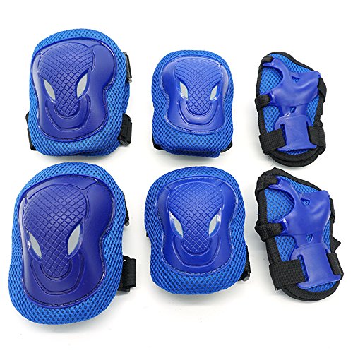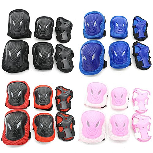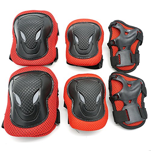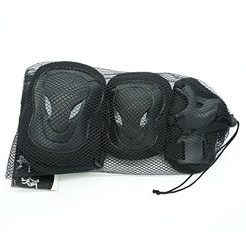-. Feature : Material: breathable net cloth + PE plastic shell (sponge pad inside) / color: black,black and red,blue,pink / the strap is adjustable / Package includes: total 6 pieces including: 2x kneecaps (height:12cm; width: 9cm) 2x elbow pads (height:10.5cm; width: 8cm) 2x handpads (height:12.5cm; width: 7.5cm)