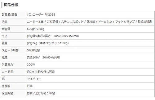 내용 : 니더《―》본체 / 반죽해 날개 / 스테인레스 포트/ 보냉 제 / 돔 뚜껑 / 취급 설명서분 용량 : 600g~2.5kg 치수 : (약)폭×(길이)깊이×높이 305×350×450mm중량 : (약)7kg(본체5kg 포트1.8kg)스피드 교환 : 5단계 교환 전원 : 교류100V 50/60Hz공용 소비전력 : 300W코드 길이 : 약2m ※떼내어 가능색 : 아이보리 생산국 : 일본