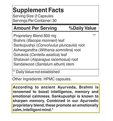 -. Feature : Calm, Intelligent Mind - promotes calmness, intelligence, stress relief, clarity, focus, concentration and memory / Vedic Calm Ayurvedic proP.R.Ietary blend takes knowledge from the millennia-old Ayurveda, the ancient healing art from India, and adapts it to the modern lifestyle. / Combining the cognitive benefits of herbs such as Brahmi, Sankupushpi, it promotes an emotionally calm intelligent mind. / Formulated by Dr. Soman Nadhan, practicing Ayurvedic physician for nearly 4 decades, who is regarded as a stalwart among present day Ayurvedic practitioners for his deep knowledge & expertise in adapting traditional Ayurveda to the modern lifestyle.