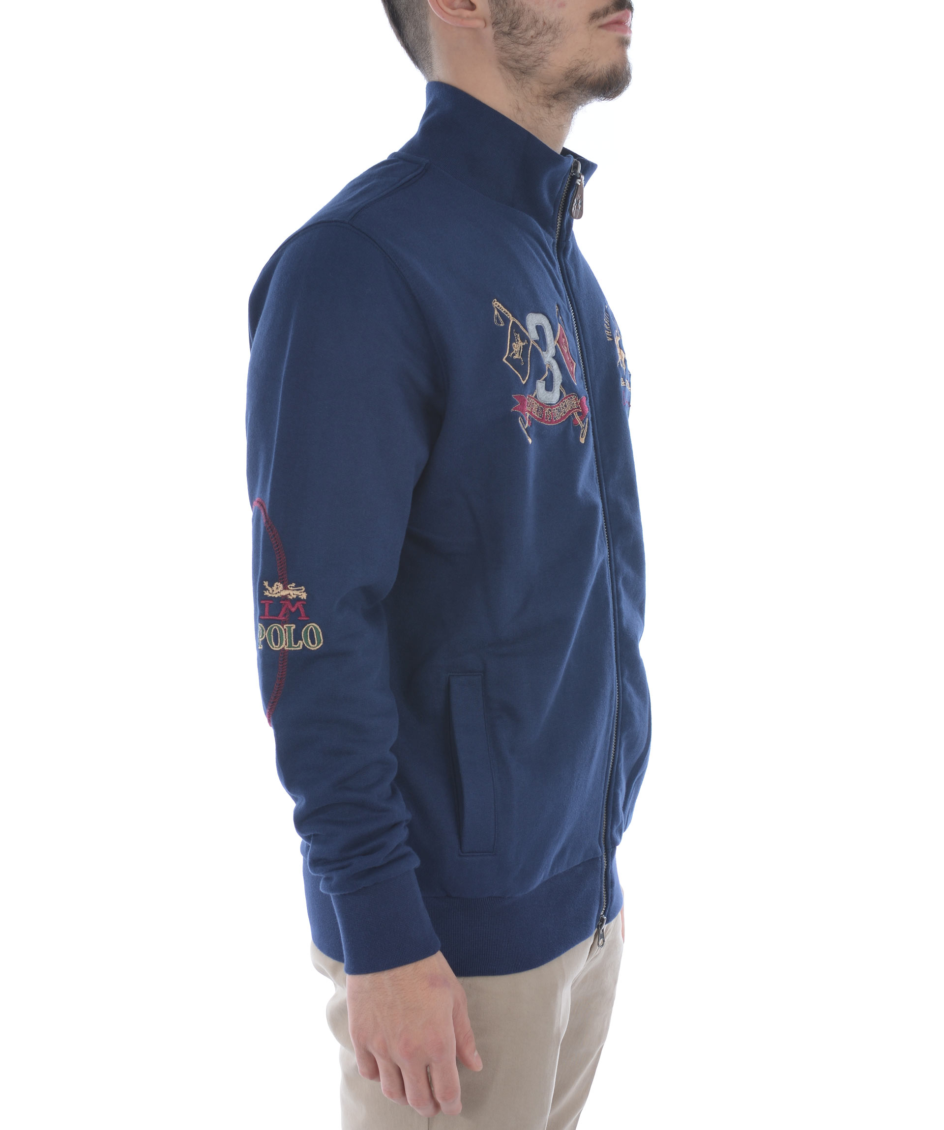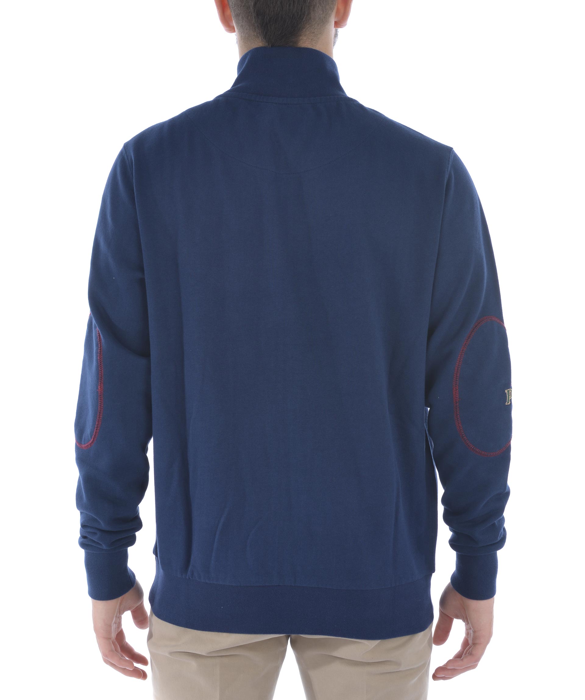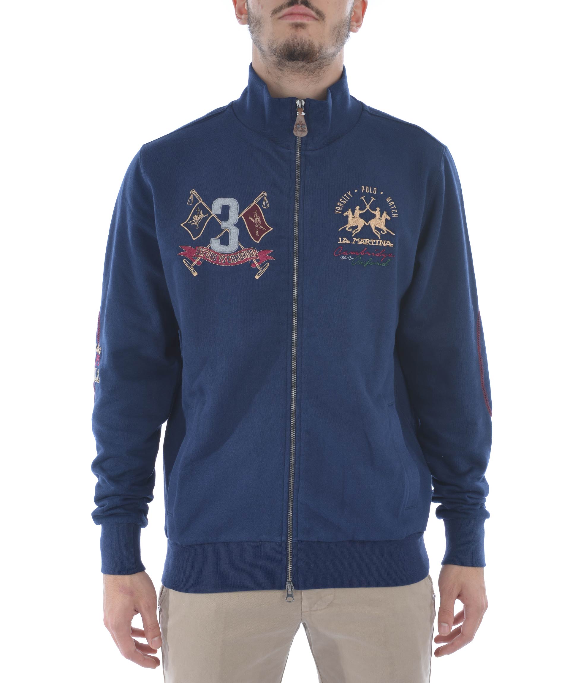 Felpa La Martina in cotone Blu. Collo alto a costine. Chiusura con zip doppio cursore. Logo e numero 3 ricamati davanti. Tasche frontali inserite. Manica lunga. Toppe ai gomiti ricamate con logo. Polso e fondo a costine. Interno felpato.