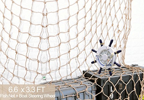 -. Feature : Wall Decor: Nautical fishing net and Mediterranean Boat Wheel Comes together, ideal decorative accessories for your photo art works, kids room, living room, mermaid / pirate them party, birthday party etc. / Quality: well knitted fishing net made by natural Jute in beautiful Tan color, durable 0.15inch rope, could hang your photos, artworks firmly safely; Large size wood boat steering wheel, elegant decoration accessory with the net / Size: Fishing net size x x inch, hole 3.9inch, rope 0.15inch (net hole size measured from knot to knot ); Large Steering Wheel Size: 9 x 9inch, thick 0.9inch; The net is very flexible, you could stretch to any shape as you like to decorate your walls / Widely Use: Hanging Photos or use as a great decoration for home, office, bar, coffee shop, bookshops, beach restaurant or parties, etc. And you could decorate it together with other nautical ornaments such as starfish, seashells, corks, rope to get a better effect / No Worry Service: If our product did not earn your full satisfaction, just return it for a full refund, no question asked. You have nothing to lose. NOTE: the fishing net is for decorative purpose
