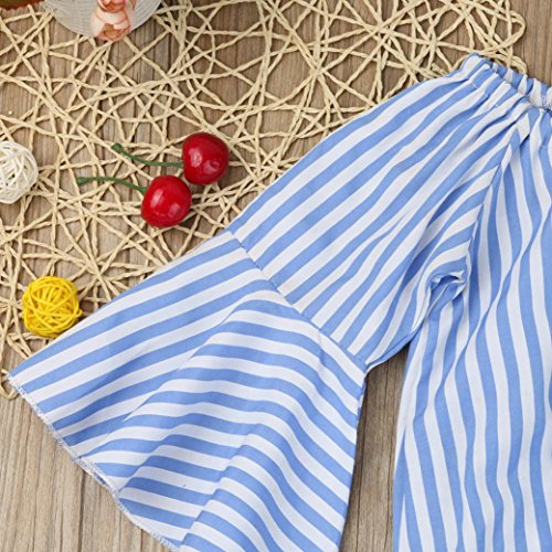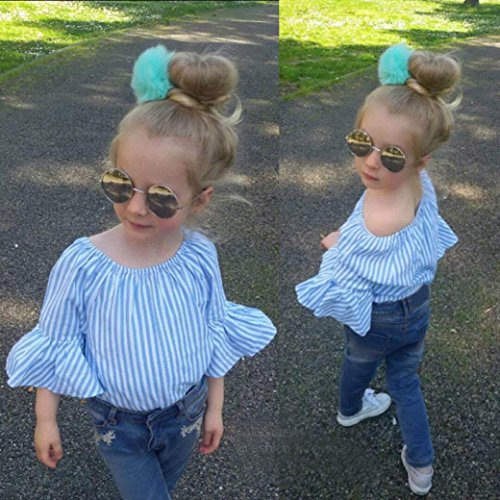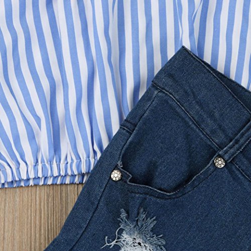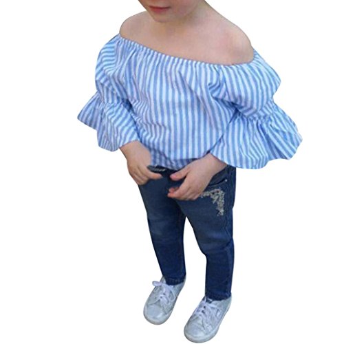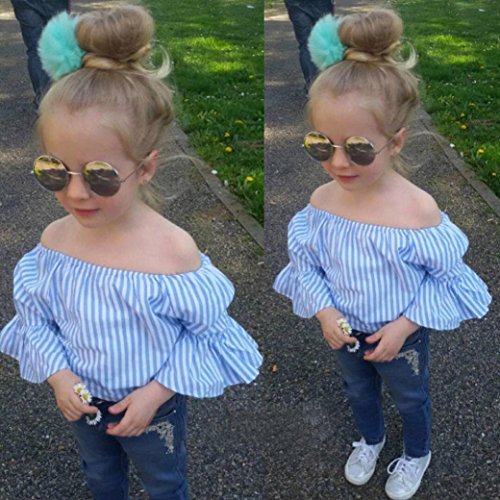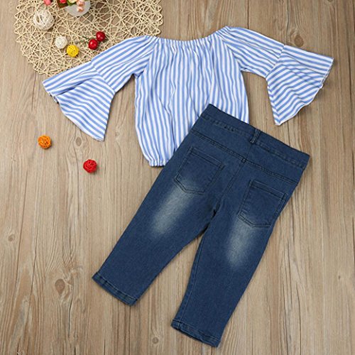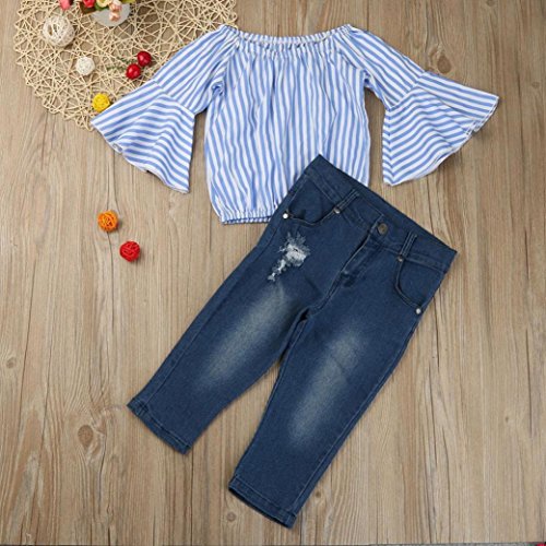 -. Feature : Package Include: 1PC Off Shoulder Striped T-Shirt+1PC Jeans Pants / Material: Polyester + Denim; Gender: Toddler Girls / Size details please see in "Product Description" / Ruffles Sleeves / Style: Summer Tops and Pants Set 2 Pieces Outfits