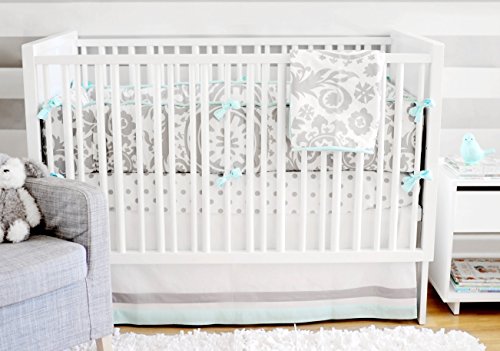 -. Feature : Includes Sheet, Skirt and Bumper / 100% Cotton, Machine Washable / Crisp White, Gray and Aqua lends to fresh feel for your baby's room