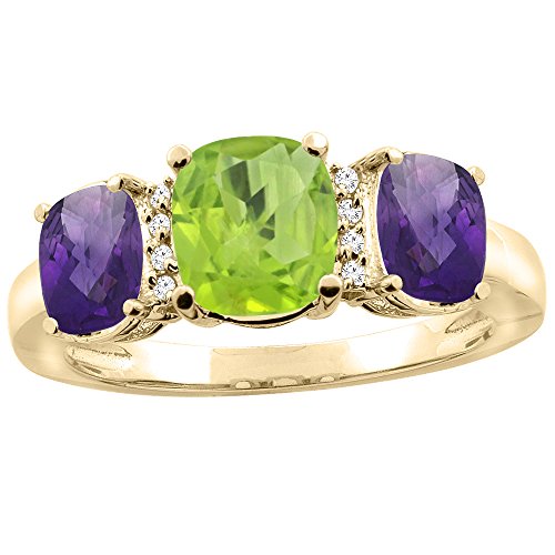 -. Title : 10K White Gold Natural Peridot & Amethyst 3-stone Ring Cushion 8x6mm Diamond Accent, sizes 5 - 10