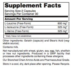 -. Feature : BCAAs help in protein synthesis and muscle recovery. This 2:1:1 ratio of essential amino acids Leucine, Isoleucine, and Valine are active in the process of muscle repair. 30 Servings of pharmaceutical grade BCAA capsules. Each serving contains 800mg Leucine, 325mg Isoleucine, and 325mg valine. Non GMO, GMP certified, no additives or artificial ingredients. Manufactured in the USA.