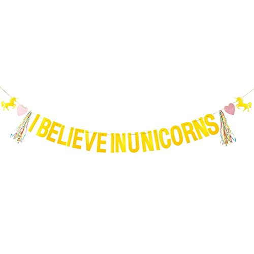 -. Feature : UNICORN BANNER, PARTY HAT, AND GARLAND SET: This pre-assembled hanging banner, party hat, and garland set is just the thing if you're planning any upcoming unicorn-themed parties or celebration events. Includes 1 "I Believe in Unicorns" banner, 6 Tassels, 12 Party Hats, and 1 Star Garland with gold unicorn heads, and silver, purple, and pink stars. / QUALITY CARDSTOCK: The entire banner is made of double-sided glitter paper and made of 250 gsm cardstock, ensuring reliable long-term usage. / CLASSY GOLD DESIGN: Using laminated glitter paper and a charming font, each letter stands out clearly and really helps in adding a nice atmosphere to your friend or loved one's celebration! / GET IT UP, ANYWHERE: Hang up this banner wherever your birthday party or celebration event may be; at your, or your friend's home, church, society, event hall and anywhere else you can think of! / DIMENSIONS: "I Believe In Unicorns" Banner String: 16.6 Feet; Letter Size: Up to 6.7 Inches; Garland String: 8.5 Feet Long; Letter Height: Varies from 2.3 to 3.5 Inches; Unfolded Cone Hat: 2 x 8 x 2 Inches; Tassels: 7 Inches; Cone Hat Strap: 19 Inches