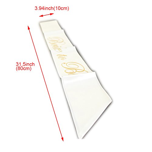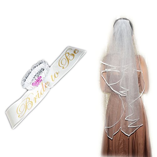Package Includes: 1 piece of white double ribbon edge center cascade bridal wedding veil with comb(32.3 inch/82 cm double veil with 1.77 inch/4.5 cm inch clip). 1 piece of gold stamp bride to be letters satin sash(Size 29.5 inch/75 cm ×3.7 inch/9.5 cm).1 piece of a leg circle with "bride to be"