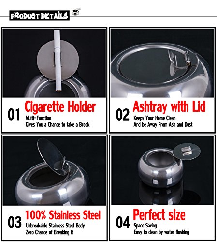 -. Feature : Made of stainless steel, drum modern design, so easy to clean / Light weight, easy to carry, very suitable for outdoor or indoor / Narrow opening for windproof. A cigarette holder welded to the inside of the lid that is very convenient for you / A beautiful art decoration for your desktop,home or office / Easy to Clean by Water Flushing