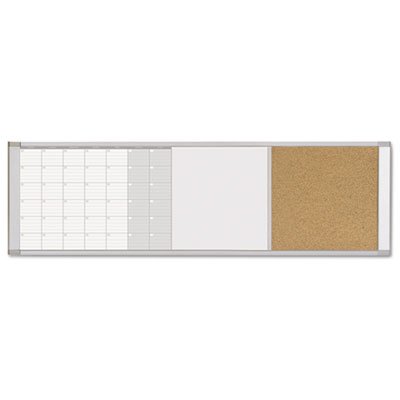-. Feature : Dimensions: 48W x 0.75D x 18H in. / Magnetic, lacquered steel white board; Aluminum frame / Contains a cork bulletin board / Features a monthly calendar display / Cork board never shows pin holes