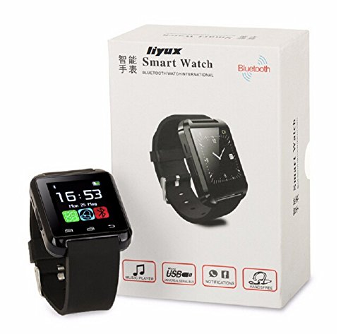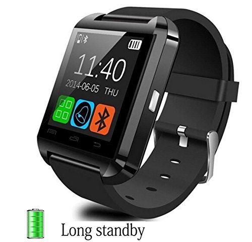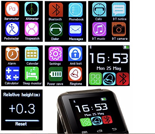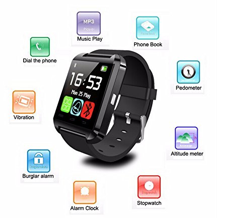 Note: For iPhone,it only supports part of the function as Pedometer, Calendar, Call Sync, Calculator, Clock, Stopwatch. Note: this smartwatch is not waterproof. SmartWatch U8 which is compatible with all Bluetooth V2.0 or above enabled smartphones, tablets and PCs (support Android 2.3 or above), such as iPhone 4, 4S, 5, 5S, 6,6S ,6S plus,Sumsung S3, S4, Note 2, Note 3, Note 4 ... model:U8 1.48 inches; Capacitive Touch Screen TFT LCD Time/Date/Week/Battery state display Ringing reminder when you receive a call Ringing reminder once your mobile phone disconnected Display the number or name of incoming calls Answer or Dial calls from watch Support hands-free calls, phone book Play the music in your phone Sync SMS/call history(only for android phone, you need download apk) Ring reminder when your smart phone receive a message (including Wechat, Facebook, Twitter, WhatsApp, Skype, and so on.(Only for android phone.) Anti-lost alarm function: When cellphone left watch alarm automatically, after a certain distance to avoid lose the phones Remote taking photo function: You can control your cellphone to take photo from the watch.(only for android phone) Stopwatch, Altitude Meter, Passometer, Photograph, Barometer, Vibration Bluetooth Version: V3.0+EDR Bluetooth Protocol: A2DP + HFP 1.5 + HS P 1.2 Range of Frequency: 2.4GHz spectrum Ambient Noise: ≤75dB Transmitting Range: ≤10m Language: English, French, Spanish, Portuguese, Korean, Italian, German, Indonesian, Finnish, Thai, Turkish, Russian, Arabic, Swedish Charging Time: about 1 hour Talk Time: about 3 hours Music Play Time: about 6 hours Standby Time: about 160 hours Power Supply: Built-in 230mAh rechargeable battery Package includes: 1 x Bluetooth Watch 1 X usb cable(not included plug) 1 x User ManualFeature