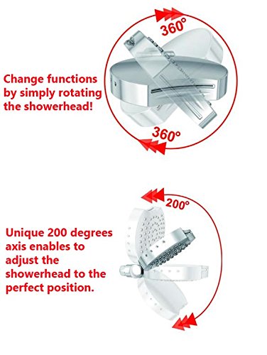 EASY & ERGONOMIC OPERATION Features an innovative 360 degrees rotating design. Seamlessly change between functions by simply rotating the showerhead. Easily switch functions even with soapy hands. / Features also a unique 200 degrees swivel axis, allowing you to adjust the showerhead to a perfect position.