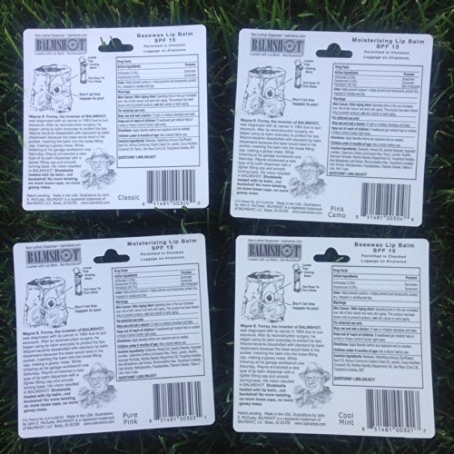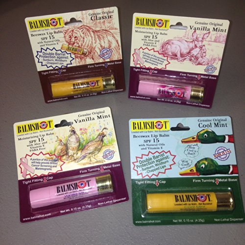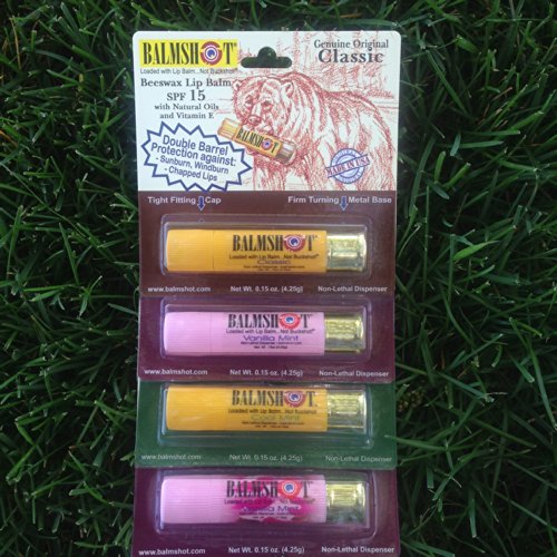 -. Binding : Health and Beauty -. Brand : BALMSHOT Lip Balm - 4 Pack of BALMSHOT SPF 15 Lip Balms -. Color : Yellow or Pink -. Department : Women -. EAN : 0851481003079 -. Feature : One of each flavor: Classic, Cool Mint, Pure Pink and Pink Camo. / Made with Beeswax, Natural Oils and Vitamin E. See photo for list of ingredients. / Super smooth, long lasting; it holds up to an active lifestyle in a jeans pocket all day long! / Fits nicely in your purse or pocket for dry lip therapy anytime, anyplace. / BALMSHOT is made in Idaho USA, patent protected, and permitted in Checked Luggage on Airplanes. -. Label : BALMSHOT, LLC -. LegalDisclaimer : Uses: Helps prevent Sunburn. Helps prevent and temporarily protect dry, chapped or windburned lips. Skin Cancer / Skin Aging alert: Spending time in the sun increases your risk of skin cancer and early skin aging. This product has been shown only to prevent sunburn, not skin cancer or early aging. For external use only. Stop use and ask a doctor: If rash or irritation develops and lasts. Keep out of reach of children: If swallowed get medical help or contact a Poison Control Center right away. Directions: Apply liberally before sun exposure and as needed. Children under 6 months of age: Ask a doctor before use. Questions? 1-800-290-0577. -. Manufacturer : BALMSHOT, LLC -. MPN : Classic, Cool Mint, Pure Pink and Pink Camo -. PackageQuantity : 4 -. PartNumber : Classic, Cool Mint, Pure Pink and Pink Camo -. ProductGroup : Health and Beauty -. ProductTypeName : HEALTH_PERSONAL_CARE -. Publisher : BALMSHOT, LLC -. Size : Standard 20 gauge Shotgun Shell -. Studio : BALMSHOT, LLC -. Title : BALMSHOT Lip Balm - Multipack of four (4) BALMSHOT SPF 15 Lip Balms -. UPC : 851481003079
