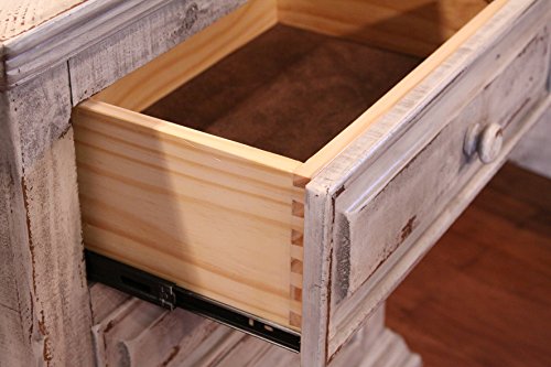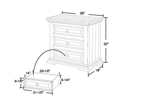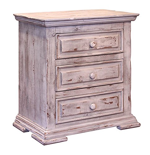 Studio : BurlesonHomeFurnishings Publisher : BurlesonHomeFurnishings Product Description Rustic Penelope 3 Drawer Nightstand Solid Wood Lodge Shabby Chic DIMENSIONS: 30 x 18 x 32 WEIGHT: 51 lb Features: 1. Featuring solid pine. 2. Multi-step, nitrocellulose-based lacquer finish in a beautiful, distressed vintage white finish. 3. Mortise and tenon case construction. 4. Microfiber-lined top dresser drawers. Ball-bearing metal glides. Magnetic catches on doors. 0