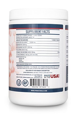-. Binding : Health and Beauty -. Brand : Excel Nutritionals -. EAN : 0748252673237 -. Feature : COLLAGEN SUPPLEMENT FOR SKIN AND JOINTS: Reduce appearance of wrinkles and support healthy skin! Support damaged or aging joints with one of the best collagen supplements for joints! / MORE THAN JUST A COLLAGEN SUPPLEMENT: Collagen Complete's other ingredients support the formation of new collagen and the protection of existing collagen in your skin, joints, nails and hair. / NATURAL FORMULA CONTAINS: Hydrolyzed Collagen Types I, II, III and MORE! (A complete collagen blend.) 10,000 mg Hydrolyzed Collagen, 2,700 mg Chondroitin and Glucosamine, 25 mg Hyaluronic Acid, 70 Trace Minerals, Proteolytic Enzymes. / BETTER ABSORPTION: Our bovine-sourced collagen hydrolysate is formulated through an enzymatic process to provide the most bio-available collagen peptides possible. / All Natural | Gluten Free | Made in USA | 100% Satisfaction Guaranteed -. IsAdultProduct : 0 -. Label : Phi Naturals -. LegalDisclaimer : Always consult your health care advisor before starting a supplement regimen if you are ill.These statements have not been evaluated by the FDA.This product is not meant to diagnose, prevent, treat or cure ant diseases or conditions. -. Manufacturer : Phi Naturals -. NumberOfItems : 1 -. PackageQuantity : 1 -. ProductGroup : Health and Beauty -. ProductTypeName : HEALTH_PERSONAL_CARE -. Publisher : Phi Naturals -. Studio : Phi Naturals -. Title : Collagen Supplement (Powder) Collagen Complete. 10,000mg of Hydrolyzed Collagen Types 1, 2 & 3, Hyaluronic Acid and More. Top-rated Among the Best Collagen Supplements. -. UPC : 748252673237
