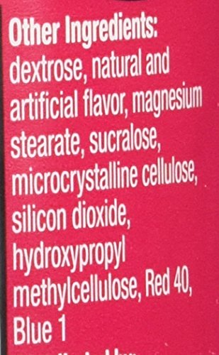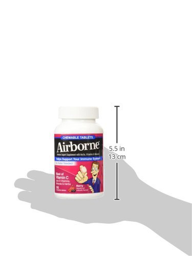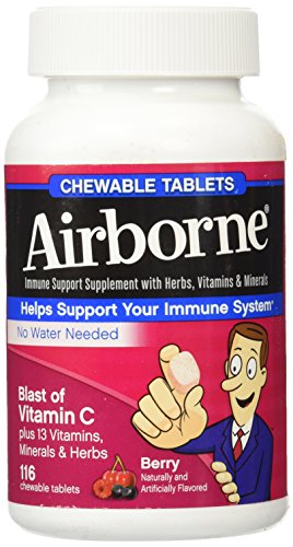 -. Binding : Health and Beauty -. Brand : Airborne -. Color : Berry -. EAN : 0647865208815 -. Feature : New Airborne® Chewables are your immune system's cheerleaders. Your immune system's got a big job to do and supporting it just got more convenient thanks to Airborne® Chewable tablets. We've included our powerful formula of 14 vitamins, minerals and herbs, including Zinc, Echinacea and a blast of Vitamin C into easy-to-chew tablets. Water not required. So give me a C! Give me an H! Give me an E-alright. You get the picture! / 4 Chewable Tablets equal: 1,000 mg of Vitamin C High in Antioxidants (Vitamins A,C, and E) Excellent Source of Zinc and Selenium 350 mg of Herbal Blend including Echinacea and Ginge -. IsAdultProduct : 0 -. Label : Airborne -. Manufacturer : Airborne -. Model : 20881 -. MPN : 289762 -. NumberOfItems : 1 -. PackageQuantity : 1 -. PartNumber : 289762 -. ProductGroup : Health and Beauty -. ProductTypeName : HEALTH_PERSONAL_CARE -. Publisher : Airborne -. Size : One Bottle of 116 Chewable Berry -. Studio : Airborne -. Title : Airborne Blast of Vitamin C Very Berry 116 Chewable Tablets -. UPC : 647865208815