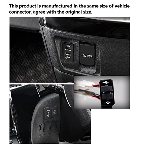 -. Feature : THIS PRODUCT IS MANUFACTURED in the same size of vehicle connector, agree with the original size.Though,you should compare the size with the picture before you place a order.When the vehicle start 2 LED blue lights would light up instantly behind the stoving varnish cover, presenting modest luxury. / IT CAN BE MOUNTED AT A SURPLUS vacant keypad, with no wiring harness to blind the driver, so that driver can focus on driving. With its ergonomic design, driver can charge their devices in a shortest extent. / THE APPEARANCE OF this product not only deP.R.Ive the role of vehicle mobile phone chargers, but also liberate drivers from looking for them all over the car.Any connector of this product can bear a maximum load of 5V 2.1A, which can afford to charge 2 Ipad at the same time. / INTELLIGENT CHARGING technique of Futuresky is applied for this product, quick charging when electricity quantity is under 5%, steady output if over 90%, protecting battery life efficiently.Main part is made of PC-ABS, heat-resistance temperature at a high of 120 Celsius degree. / SURFACE COVER PAINTED with PC baking varnish, providing high class excellence.1M One to 4 USB 2.0 cable for distribution(White),and Gift packaging which looks beautiful and can be a gift choice for you.