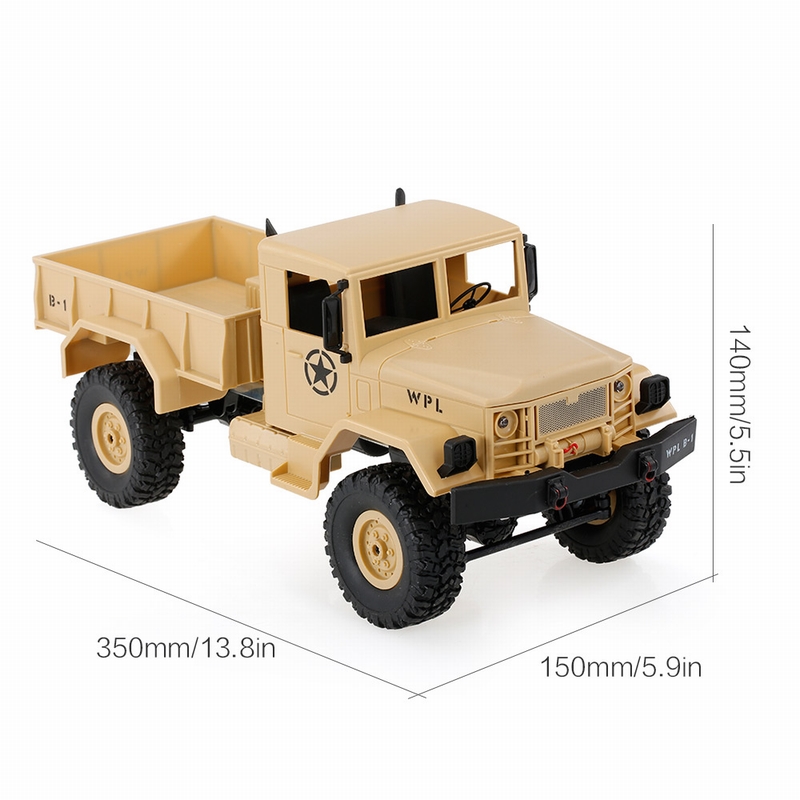 WPL B-1 1:16 off-road RC military truck features 4-wheel universal drive shaft and thick C shape metal suspension beam that enable it to load heavy things and steer easily in any direction. With the wear-resistant vacuum tires and high ground clearance, the RC vehicle excels in running on uneven roads. The two imported LED at the front emit strong light, ensuring the safety of driving in the darkness. With RC model frame design, you can upgrade this truck to a proportional controlled RC model with ease.