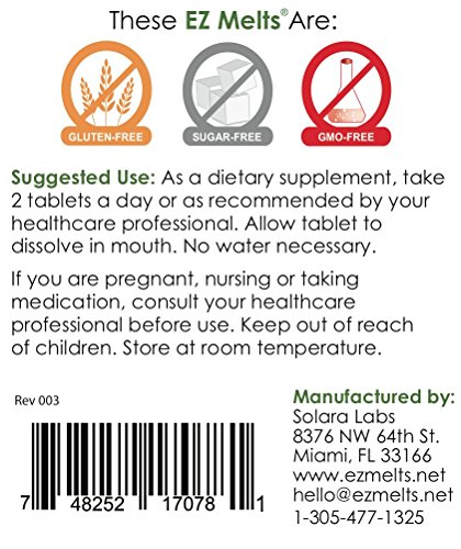 Studio : EZ Melts Publisher : EZ Melts Binding : Health and Beauty Product Description EZ Melts® are a full line of fast melting dietary supplements that are specially formulated to melt in the mouth quickly without the need for water. They are perfect for those who dislike swallowing pills or are prevented from doing so for medical or lifestyle reasons, or simply for those who want the benefits of quality, great tasting supplements. Advantages of EZ Melts®: Tablets melt rapidly in the mouth with a smooth feel - no need for water or swallowing large pills. Active ingredients become readily available for absorption before entering the digestive tract. Great tasting formulas featuring popular ingredients across the spectrum of health categories. We uphold the highest standards of regulatory compliance to ensure that our products are manufactured with safety, integrity and in accordance with the current Good Manufacturing Practices (cGMPs). We are an FDA-registered, USDA-approved facility and have been audited by regulatory authorities. 0