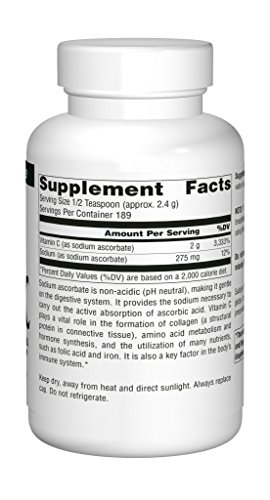 Vitamin Supplement. Sodium ascorbate crystals. Supports immune system (These statements have not been evaluated by the Food and Drug Administration. This product is not intended to diagnose, treat, cure or prevent any disease). Sodium ascorbate is non-acidic (pH neutral), making it gentle on the digestive system. It provides the sodium necessary to carry out the active absorption of ascorbic acid. Vitamin C plays a vital role in the formation of collagen (a structural protein in connective tissue), amino acid metabolism and hormone synthesis, and the utilization of many nutrients, such as folic acid and iron. It is also a key factor in the body's immune system (These statements have not been evaluated by the Food and Drug Administration. This product is not intended to diagnose, treat, cure or prevent any disease). Suitable for vegetarians. Contains no yeast, dairy, egg, gluten, soy or wheat. Contains no sugar, starch, preservatives, or artificial color, flavor or fragrance.Feature