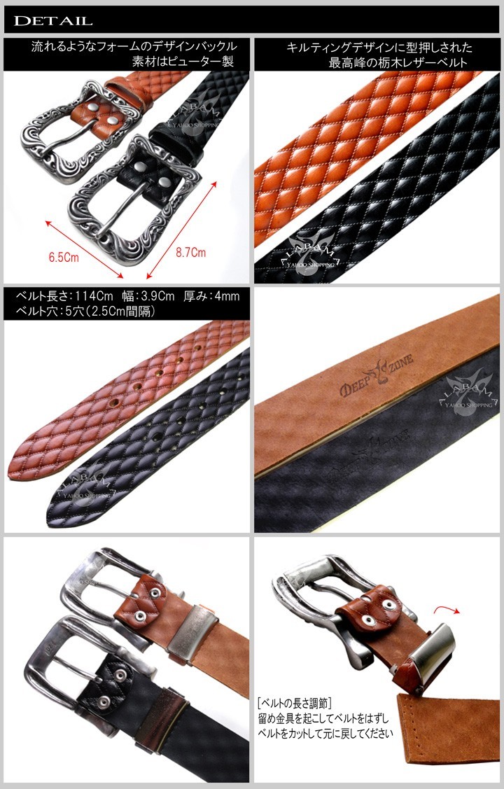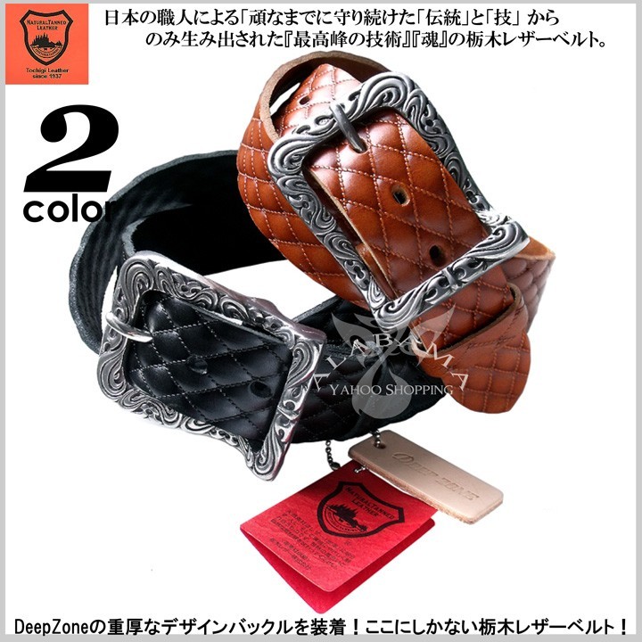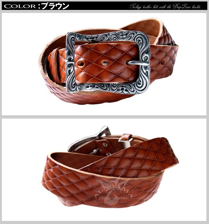キルティングデザインに型押しされた栃木レザーベルト栃木レザーベルトにDeepZoneオリジナルデザインバックルを装着!希少価値のショルダーレザーベルトを使用しています。日本の職人による「頑なまでに守り続けた「伝統」と「技」 からのみ生み出された『最高峰の技術』『魂』の栃木レザーベルト。栃木レザー「フルベジタブルタンニングレザー」を使用し、日本の熟練した職人が一つ一つ丁寧に作っています。使い込むほどに深みのある革に変化します。素材:ベルト・・牛革(栃木レザー) バックル・ピュター製(DeepZone)ベルトカラー:ブラウン/ブラッククロス系 ハード系 スカル系 ファッションyahoo ショッピング