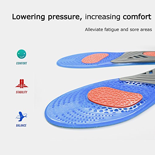 - High Quality Material: Plantar Fasciitis gel shoe insoles is made of medical grade gel and built specifically to relieve foot pain and aches. Make of GEL+ TPU material and provide more better cushioning effect and comfort.