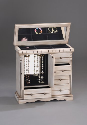 -. Binding : Kitchen -. Brand : AMERIHOMESTORE -. Color : AGED WHITE -. EAN : 4713282499092 -. Feature : All piece made in solid wood with hand-made carving details / Top lid opens with mirror, 5 slide out drawers / Ring roll holder on the top storage / 2 Swing doors, necklace holder inside / Black lining and body in aged white finish -. Label : AMERIHOMESTORE -. Manufacturer : AMERIHOMESTORE -. Model : SSJB0184WH -. MPN : SSJB0184WH -. PackageQuantity : 1 -. PartNumber : SSJB0184WH -. ProductGroup : Home -. ProductTypeName : HOME -. Publisher : AMERIHOMESTORE -. Size : 17.5" x 7 "x 17" -. Studio : AMERIHOMESTORE -. Title : AMERIHOMESTORE ANTIQUE WHITE LARGE WOODEN JEWELRY BOX CASE