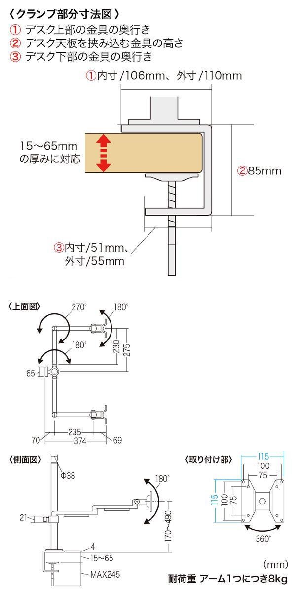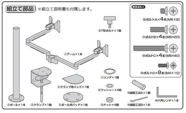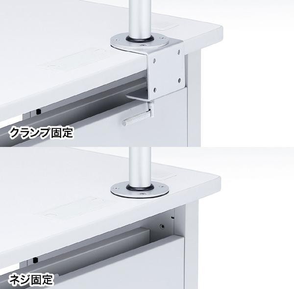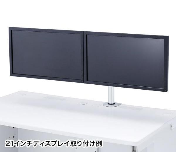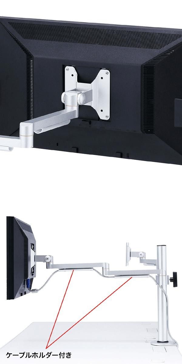 | 水平空間に対して全方向に自由に動かすことができ、液晶ディスプレイを左右2面並べて設置できるモニタアームです。工場内の案内掲示用、会議室などの液晶テレビの設置などにも使用できます! |