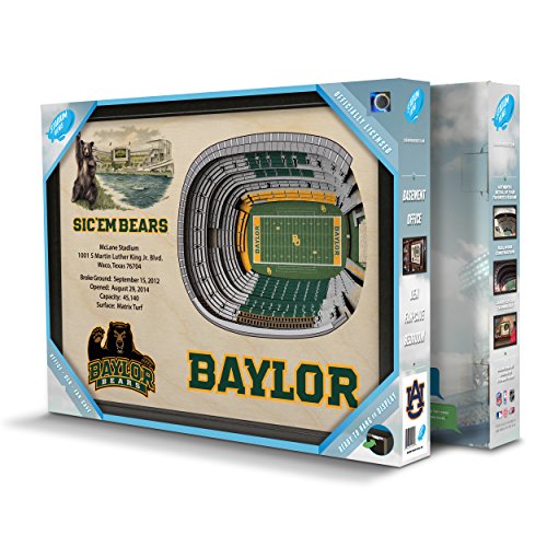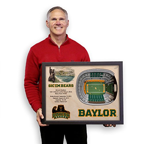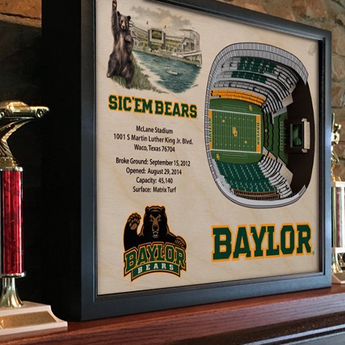 The baylor bears stadiumview wall art 3-D stadium replica of mclane stadium is hand crafted in the USA from white Birch wood. StadiumViews three dimensional wall art reproductions feature hand drawn original artwork and stadium facts and features. These Heirloom quality works of layered wooden wall art are three inches deep and are finished with a dark Brown wood composite frame that includes hardware for hanging. A superb gift for the devoted baylor bears fan that truly inspires admiration. The best stadium view is a stadiumview!Feature
