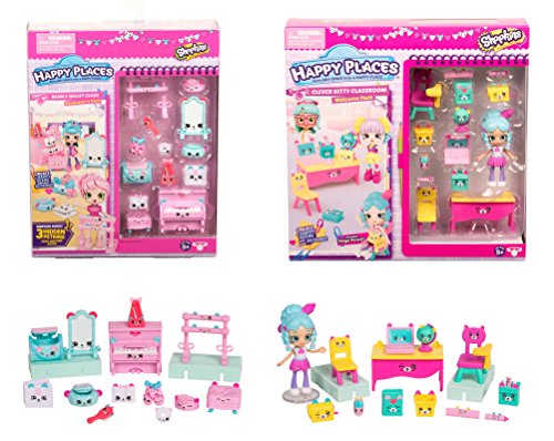 Happy places welcome pack contains one lil shoppie, 1 x doll stand, 1 x large petkin, 2 x medium petkins, 6 x small petkins, 4 x mini petkins, 2 x tiles & 1 x catalog