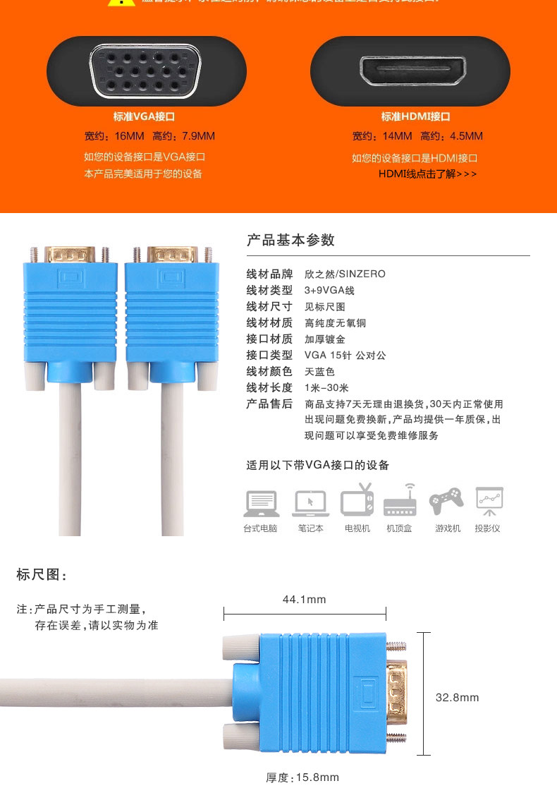 欣之然高清VGA线电脑连接显示器电视vga连接线视频线投影线信号线