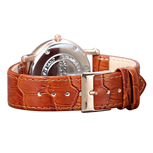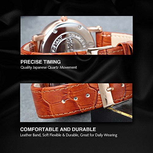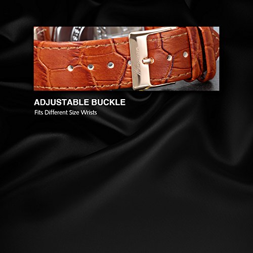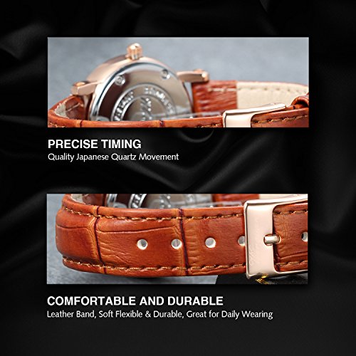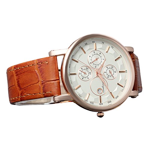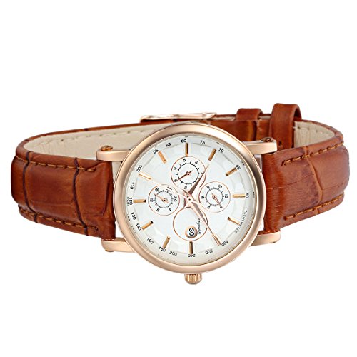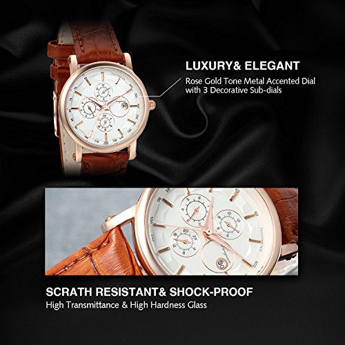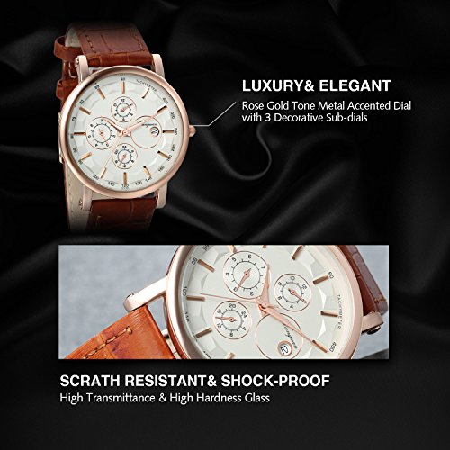 -. Feature : PRECISE TIME KEEPING: quality japanese quartz movement providing precise and accurate time keeping. / ELEGANT DESIGN: rose gold tone metal accented dial with 3 decorative sub-dials / CALENDAR FUNCTION: calendar function, perfect for travelers. / COMFORTABLE AND DURABLE: adjustable leather band, fits different size wrist, great for daily wearing / WATER RESISTANT: Splashproof ONLY, please do NOT wear it when diving, swimming, snorkeling, water-related work or fishing