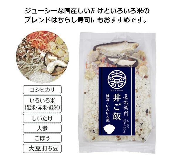 | 「嘉右衛門・新潟産コシヒカリ」に椎茸、根菜等を嘉右衛門ブレンドしました。炊飯器で炊き上げたのち、お肉やお魚などの具をトッピングすれば美味しい丼ごはんに。お酢を加えて酢飯にすれば豆の出汁・野菜の旨味がひときわです。 |