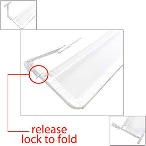 - Feature : This kid's bed rail for makes sure they stay tucked in and safe from falls throughout the night / Easy to install and even easier to use. Just snap the bed guard rail together, slide it between your child's bed mattress and box spring, and it will do the rest! The weight of the mattress and friction on its rubber skid pads will hold it - and your child - in place / After bedtime, the bed side rail unlocks and folds down, or folds flat for quick removal and storage. It can also be quickly disassembled for portability / No tools for assembly or installation. Fits any bed! Note: The wide, overbuilt hinges may be a snug fit for beds using frames with rimmed edges / The Longest Bed Saftey Rail: Measures: 60in. long x 17in. high. Subtract the height of child's mattress from 17in, to figure out the functional net height.