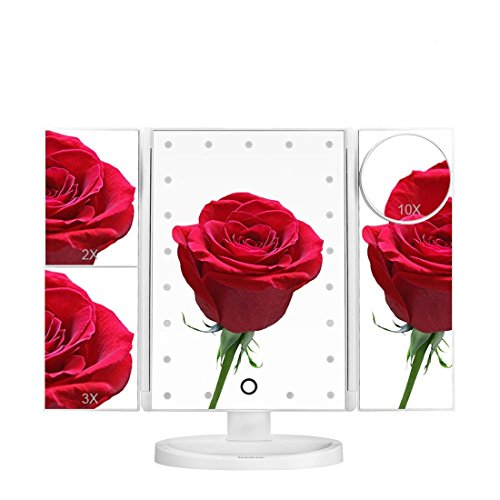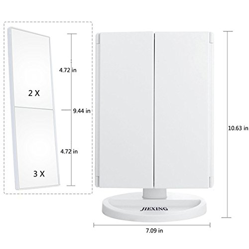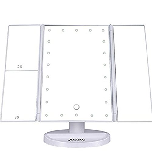 JIEXING Vanity Makeup Mirror Trifold 22 LED Lights with Touch Screen Control, 3X/2X/1X Magnification,180 Degree Free Rotation and USB Charging Mode Cosmetic Mirror