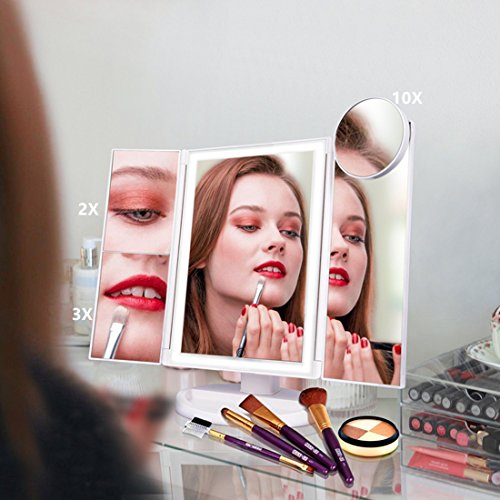 - TRIFOLD DESIGN MAKEUP MIRROR: Three panels foldable design like a book,Center mirror and two side mirrors give you a perfect panoramic view of your face. Easy to take away and daily maintenance.
