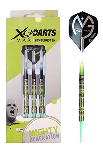 -. Binding : Misc. -. Brand : XQ Max Darts -. EAN : 9415639090031 -. Feature : Precision machined from 90% tungsten ensuring a slim barrel diameter for high grouping and scoring for the intermediate aspiring player / Features durable shaft and standard shape flight for the optimal accuracy in balance and flight. / Includes extra set of shafts and tips / Set of 3 darts / Official World Champion Michael van Gerwen (MvG) licensed product -. IsAutographed : 0 -. IsMemorabilia : 0 -. Label : XQ Max Darts -. Manufacturer : XQ Max Darts -. MPN : MDMG9018-SF -. PackageQuantity : 1 -. PartNumber : MDMG9018-SF -. ProductGroup : Sports -. ProductTypeName : SPORTING_GOODS -. Publisher : XQ Max Darts -. Studio : XQ Max Darts -. Title : Michael van Gerwen Mighty Generation 90% tungsten 18gm soft tip dart set