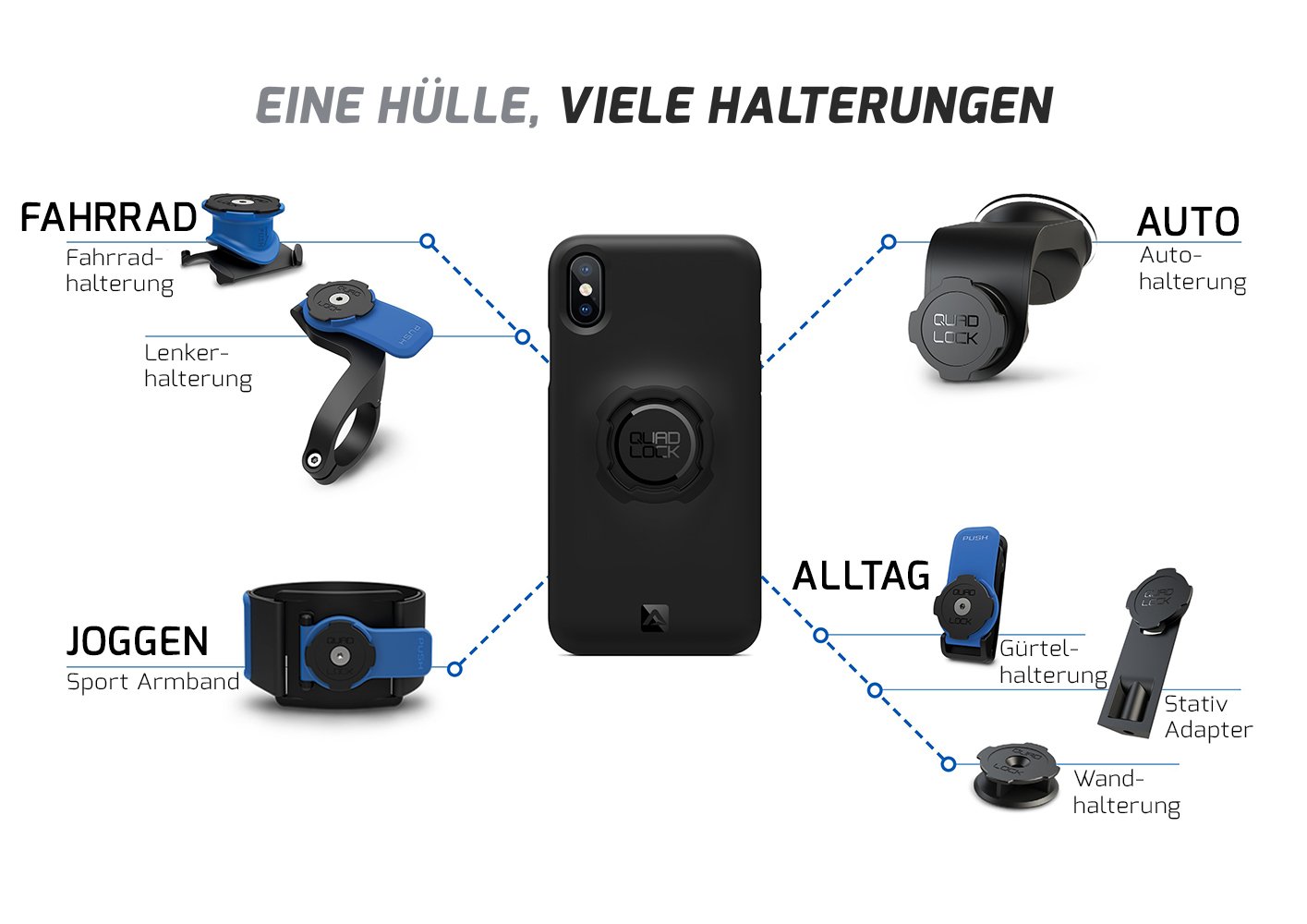 The central Quad Lock dual lock system is compatible with various parts such as car mounts, bike mounts, running arm bands.