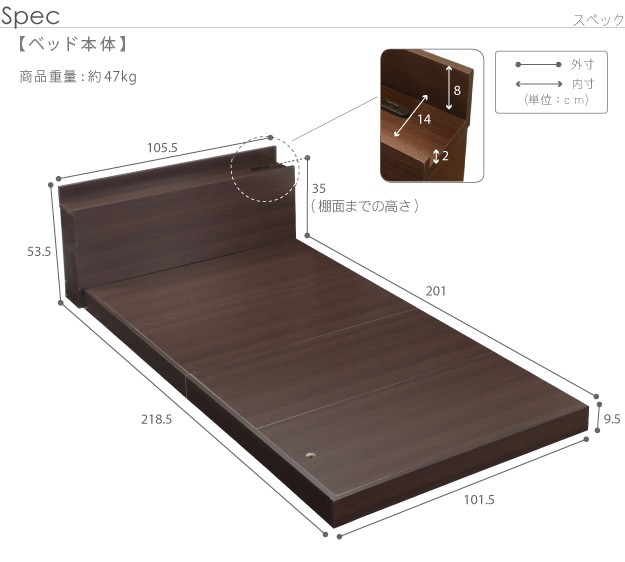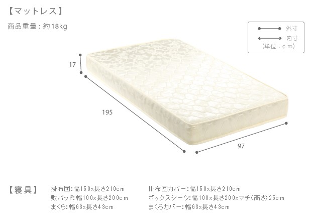 サイズ(cm):[ベッド]幅105.5x奥行218.5x高さ53.5(床板高さ9.5)cm・約47kg、[マットレス]幅97x奥行195x高さ17cm・約18kg