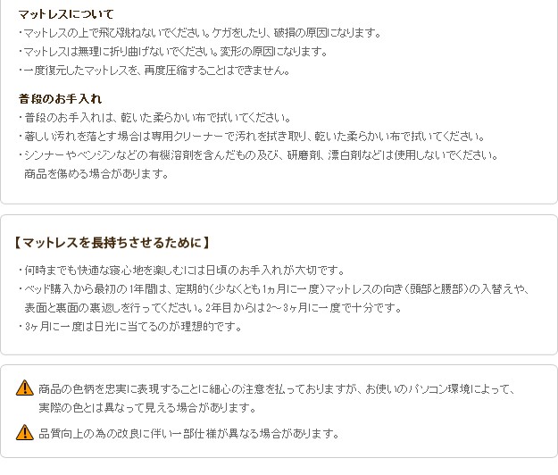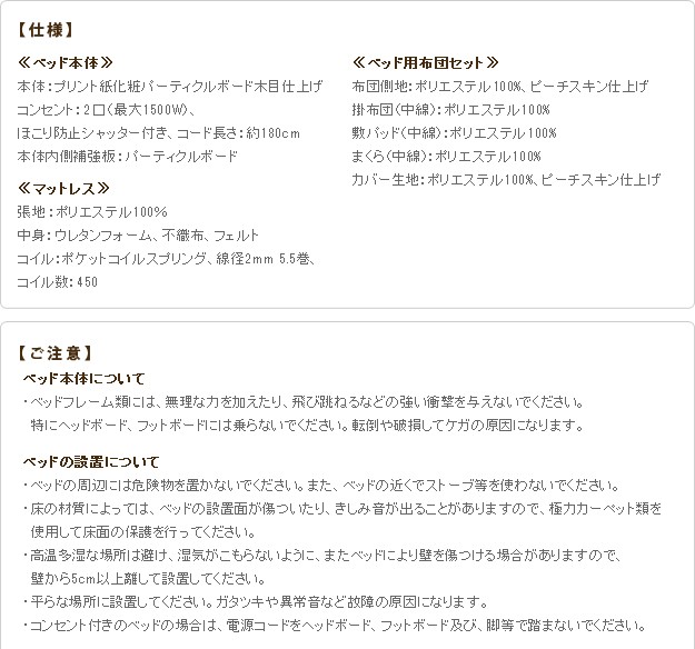 材質:[ベッド]本体-プリント紙化粧パーチクルボード、コンセント-2口(1500W)、[マットレス]側生地-ポリエステル100%、中身-ウレタンフォーム1cm、ポケットコイルスプリング高さ15cm・450個、不織布、フェルト、[布団]側地・カバー生地・中綿-ポリエステル100%(側地・カバー生地はピーチスキン仕上げ)