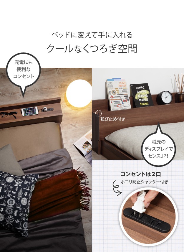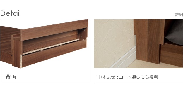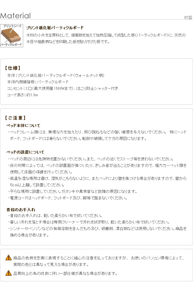 材質:本体-プリント紙化粧パーティクルボード(ウォールナット柄)、本体内側補強板-パーティクルボード、コンセント-2口(フタ付き)合計1500W・コード長1.8m